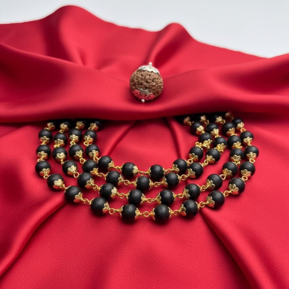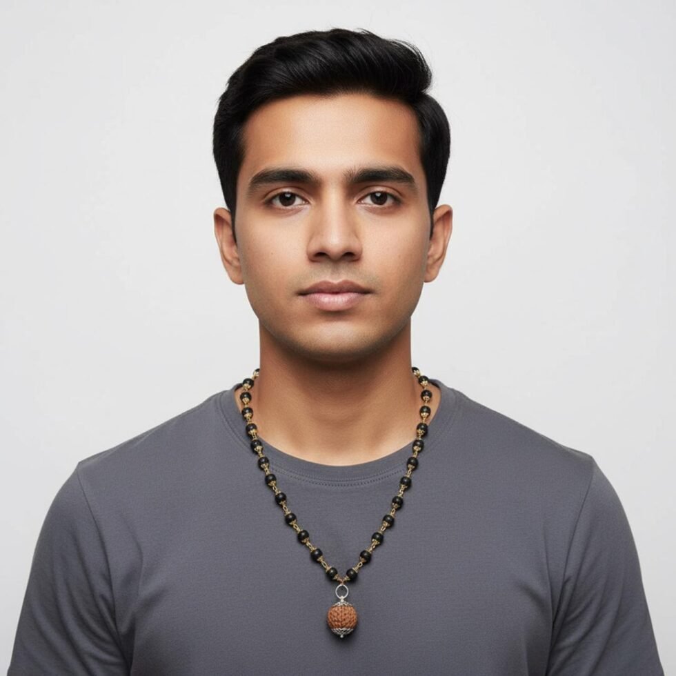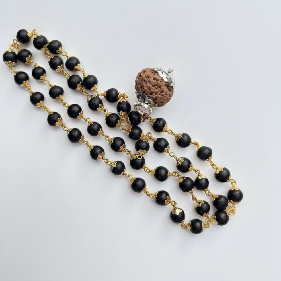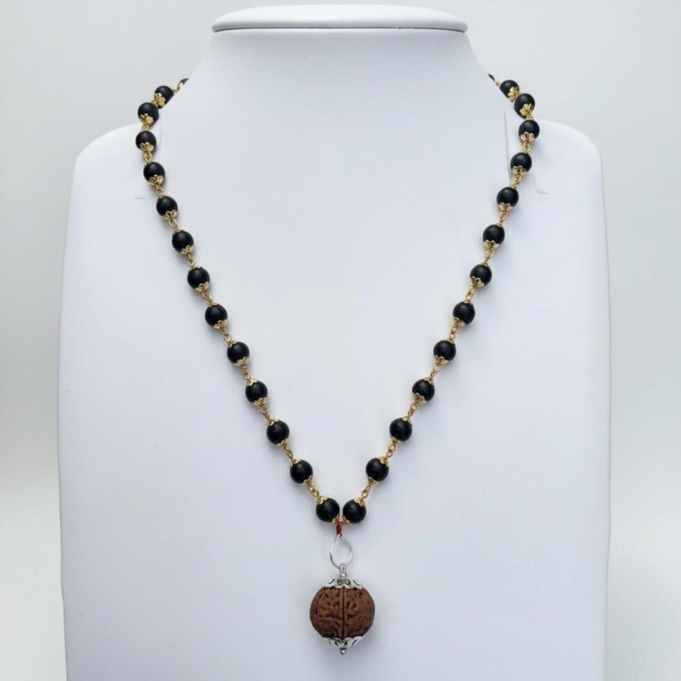 The 5 Mukhi Rudraksha is revered for its ability to enhance health, mental clarity, and spiritual growth, while the Karungali golden-capped bead adds elegance and amplifies the pendant’s protective and positive energy.
